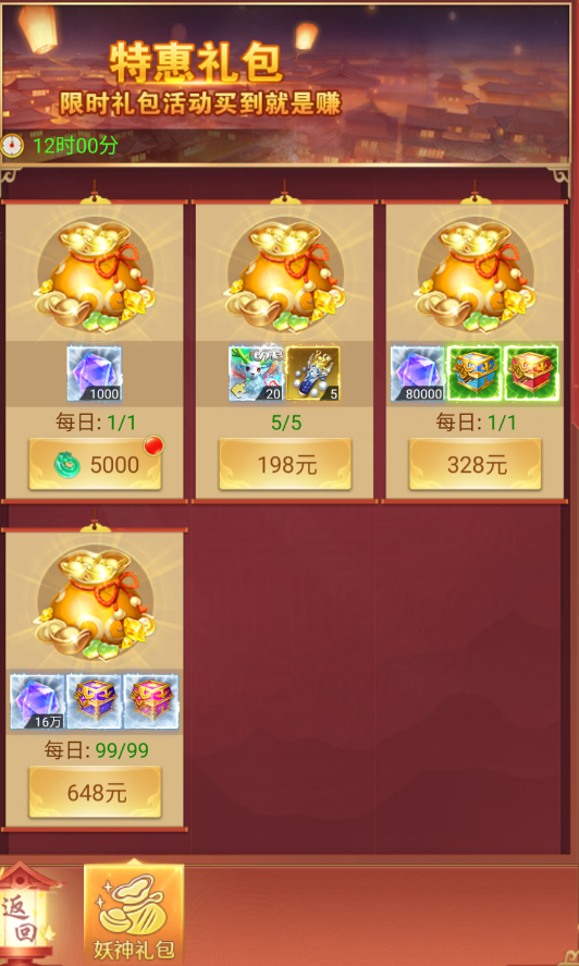 总共有4个特惠礼包,礼包每日有限购次数,仙友们可根据自身情况来选择购买~