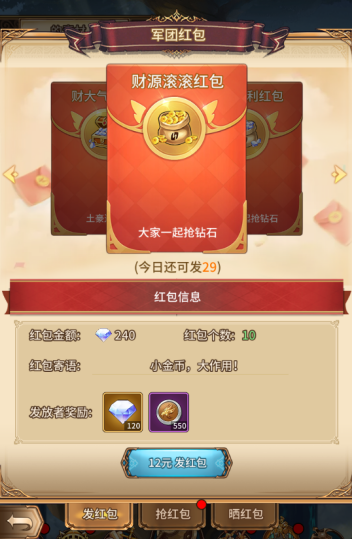 加入军团后即可领取红包,军团红包分3个部分,发红包、抢红包和晒红包,发红包需要玩家购买红包才可发放,玩家可购买12元、50元、648元的红包来发放,价格越高的红包发放者获得的奖励就越丰富,每个档位的红包都有次数限制。红包发放后会在抢红包处出现来自某玩家发放的红包,军团成员点击领取即可获得一定数量的钻石,每个红包可以领取10次,一人最多可以领取一次该红包,晒红包可以查看军团成员发放了多少个红包和发放的总价值。