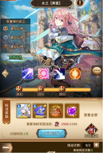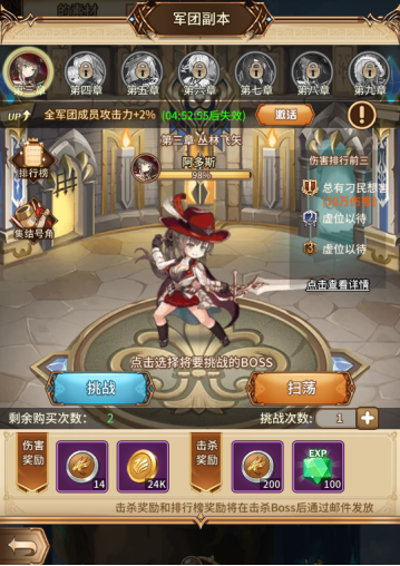 军团副本总共有100章,每章都需要把BOSS击杀后才能开启下一章,该BOSS属于世界BOSS,需要每个军团成员齐心协力方可击杀。挑战次数每天有2次,使用完后还可以花费20钻石购买挑战次数,最多可以购买4次,BOSS头顶上有一个激活按钮,军团成员可以消耗20钻石激活该功能,激活后可以提升全体成员2%的攻击力,奖励分伤害奖励和击杀奖励2个部分。