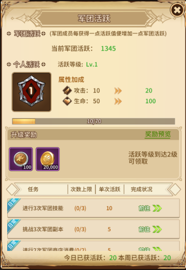 玩家在军团捐献处捐献完后可以在军团活跃处升级并领取一定的军团贡献和金币,升级奖励需要根据活跃等级才能领取,等级越高获得的奖励就越好。