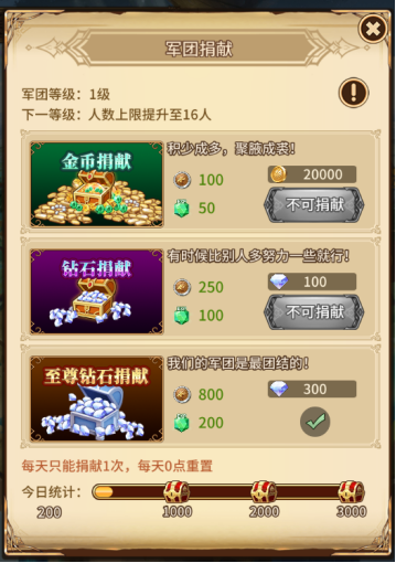 军团捐献分为3个部分,金币捐献、钻石捐献、至尊钻石捐献,玩家每天最多可以捐献一次,每天0点重置捐献次数,捐献的档位越好军团等级升得越快,同时成员获得的奖励也越好。