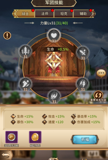 军团技能分为4个阵容技能,分别是战士、法师、坦克、辅助,玩家需要消耗一定量的军团贡献和金币进行升级,提升军团技能可以快速增加战斗力。
