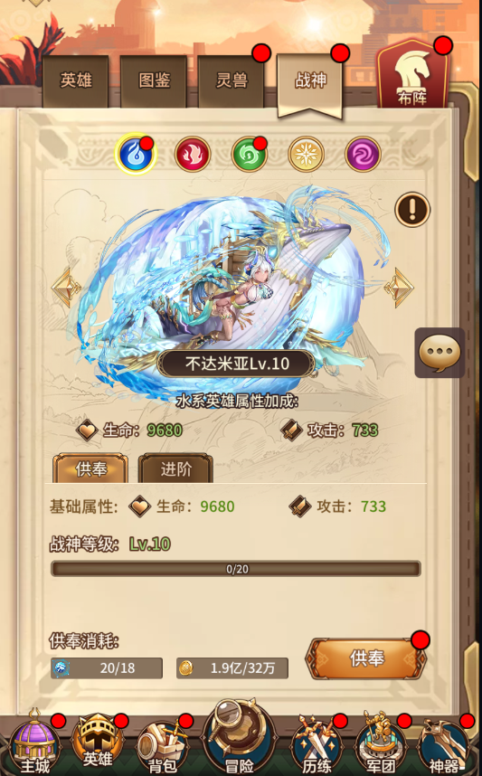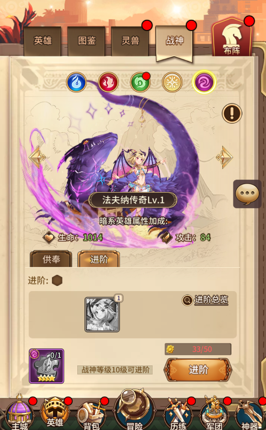 战神等级每提升10级即可进阶一次,最高可进阶到10阶,进阶需要消耗相应系别的英雄和金色觉醒纹,金色觉醒纹可通过众神战场获得。进阶后额外提升对应系别战神百分比属性。