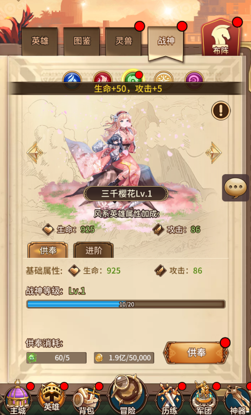 可参与众神战场获得不同系的战场碎片,使用战场碎片和金币可对战神进行供奉并提升战神等级和属性。周一至周五轮流开启不同系别的众神战场,周末可开启全部系别的众神战场。