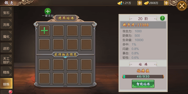 3、单击熔炼物品栏中的装备,熔炼后将获得对应熔炼值;让熔炼值满时,可获得永久属性加成。