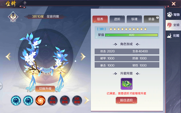 1.坐骑培养可提升角色基础属性,满星后可通过进阶来解锁新的培养上限。