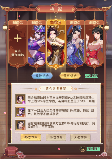 通过西游取经获得赠礼道具,提高道侣等级可在战斗中提供增益状态并提高全体神将属性。