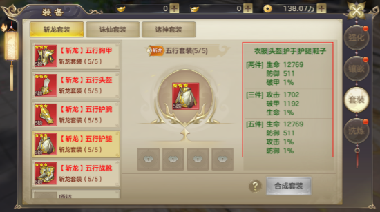 3.套装的锻造需要消耗套装石,斩龙套装锻造需要消耗斩龙套装石(套装石通过打宝、日常活动可以获取),锻造后可以获得斩龙套装属性;诛仙套装则需要战龙石+诛仙套装石才能经行锻造,激活后的套装属性比战龙套装足足高了一倍多。