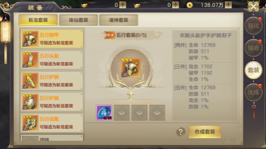 2.斩龙套装最低要5阶橙色品质才能经行锻造,诛仙套装最低要5阶红色品质才能锻造,诸神套装需要9阶红色3星品质才能经行锻造。作为新手来说,前期主要还是以斩龙、诛仙套装为主。