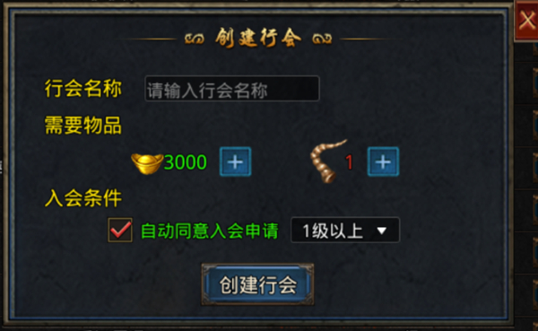 人多力量大,想要获得更多的资源,加入行会更有保障。创建行会的条件是需要消耗3000元宝和道具沃玛号角一个,输入行会名称,同时可以设置入会条件。