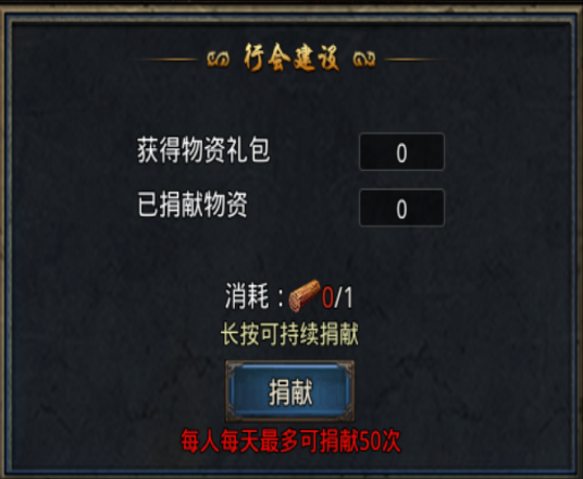 点击行会建设,需消耗坚硬的桦木(可在行会地牢获取)进行建设,可帮助行会升级(每人每天最多可捐款50次)