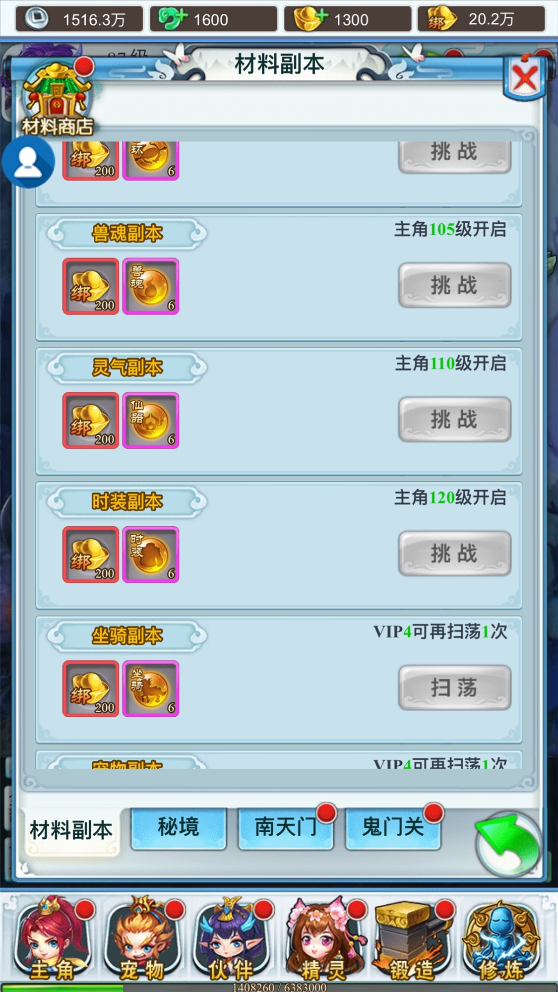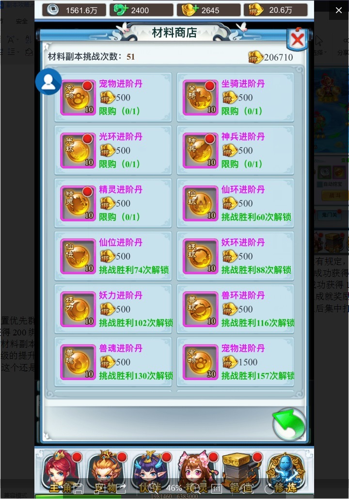 材料副本的难度比较简单,推荐人物技能设置优先群攻技能,通关副本会按照等级要求开启,通关副本之后可以获得200绑元以及相应材料,材料副本每天可以免费打一次,首次开启的材料副本需要挑战,挑战之后有副本次数都可以进行扫荡,随着VIP等级的提升可以增加材料副本的次数,购买一次次数需要消耗185元宝,这个还是比较划算的;材料副本还有一个材料商店,挑战副本次数达到要求可以在商店内买到相应的道具,里面的道具价格会比较划算。
