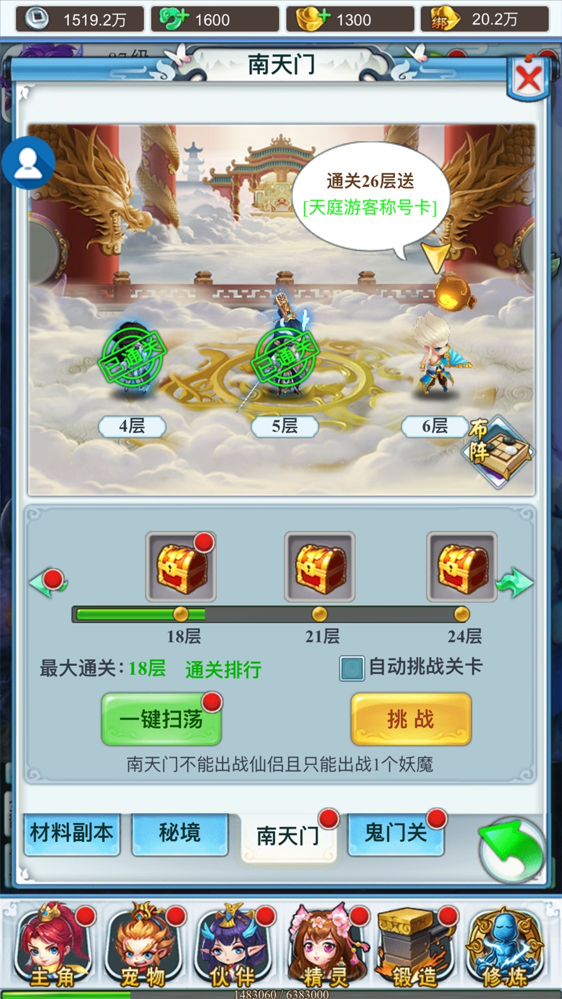 南天门副本的难度比较高,不能出战仙侣且只能出战1个妖魔,也就是说只能上阵角色和宠物跟1个妖魔,在上阵伙伴数量减少的情况下,输出就会变得紧缺,这个时候更需要提升清小怪的能力,保证4回合内打败所有的怪通关副本,布阵按钮可以设置好上阵宠物以及妖魔,这个副本也可以通过累计评价获得奖励~