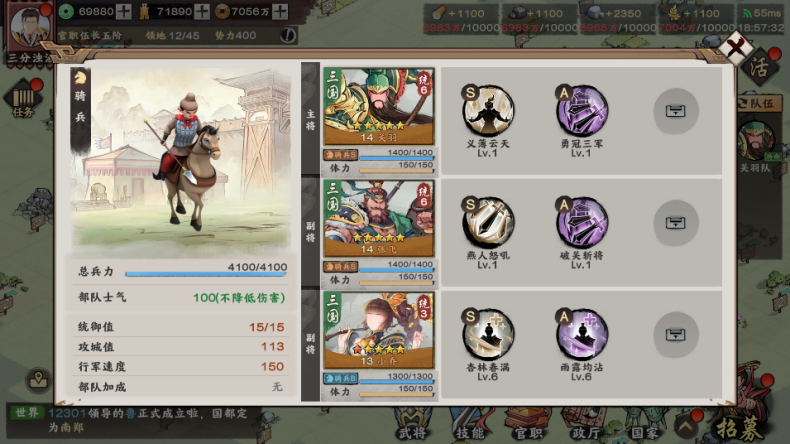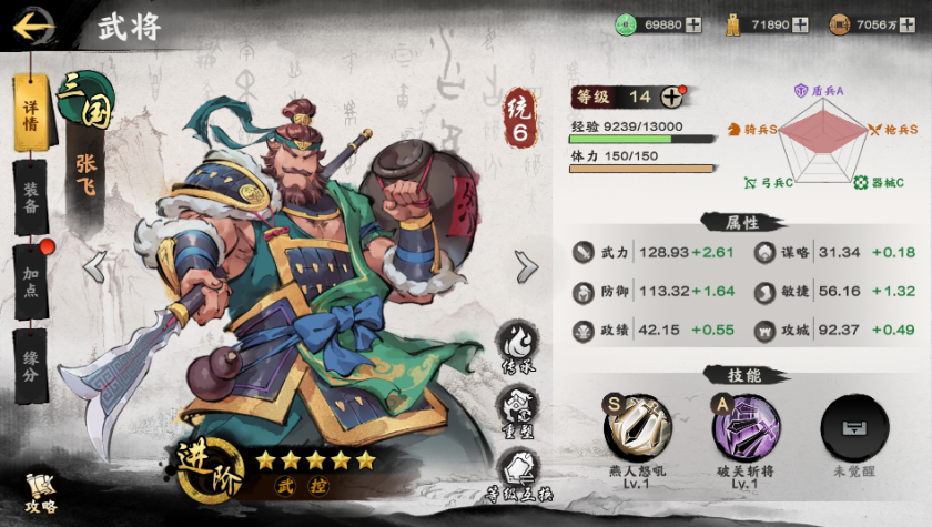 张飞是位控制能力出众的攻击型武将,其自带技能“燕人怒吼”可令张飞在准备1回合后对敌军群体造成武力伤害,并概率为敌军群体施加恐惧状态。为他搭配“一夫之勇”“破关斩将”以发挥其输出威力,从而让其能对敌打出高额的群体伤害。