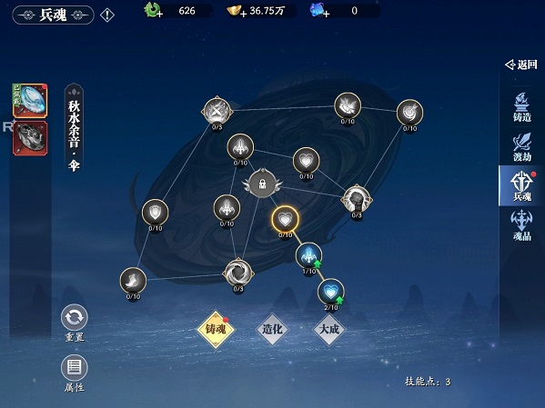 如果想要调整培养的天赋点方向,各位御灵师还可以选择重置,通过消耗一个神兵归元令重置当前的天赋树,进行全新方向的培养。技能点可以用来升级技能,也可以激活新槽位,每个槽位所带来的增幅属性不同哦~当渡劫达到天灵、玄元境界后,还会分别开放造化、大成的培养方式,对神兵进行更深度的冶炼。