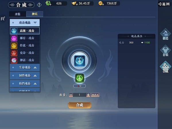 在进行魂晶合成时,也是有特别的数量要求的哟,四个同品质同类型的可合成为一个更高品质同类型的魂晶~同时,合成也将会优先选择玩家穿戴的魂晶,免去玩家合成后的替换操作,可谓贴心满满,变强就算这么轻松的事儿~