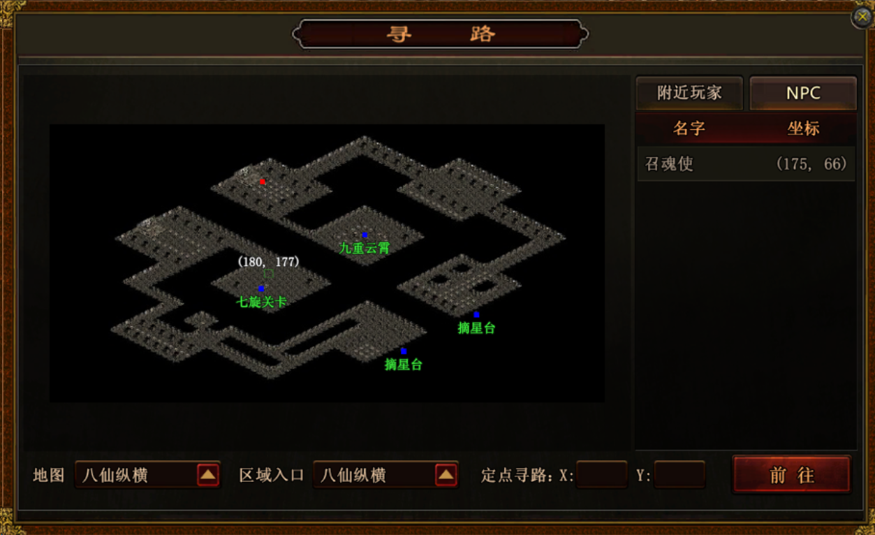 2.在八仙纵横地图内有两个摘星台传送门,需要先传送摘星台才能进入九重云霄。(可以通商城花费50绑定元宝购买通天卷轴直接传送至八仙纵横。)