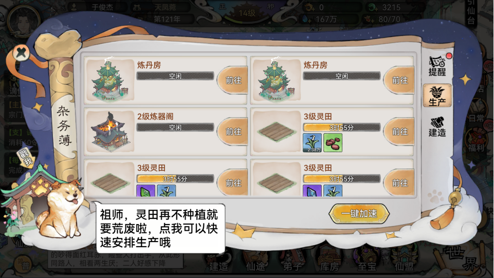 说了这么多,是不是觉得操作比较繁琐呢,其实游戏内有许多便捷性操作,可以实现摸鱼修仙。合理的利用大黄狗,祖师平常通过点击右下角杂务簿查看天狗,可以设置待完成事件提醒,戳戳天狗还可以设置资源一键生产。