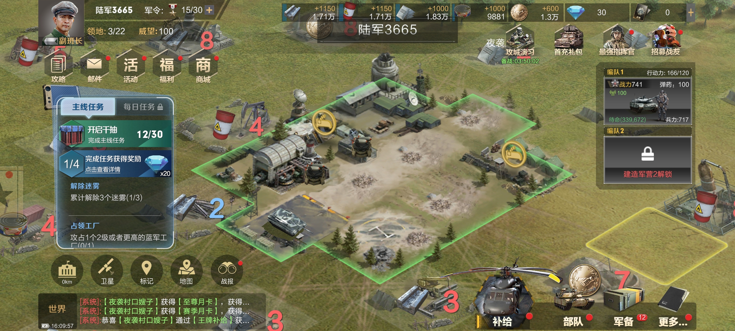 话不多说,小泛这就为大家介绍一下基地中的建筑,基地中共有6大建筑,分别是指挥所、军营、征兵处、驻防所、兵工厂、研究所。