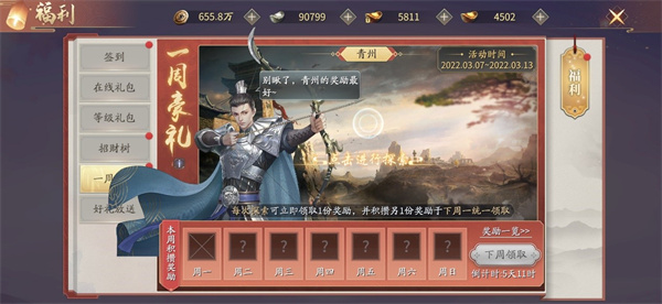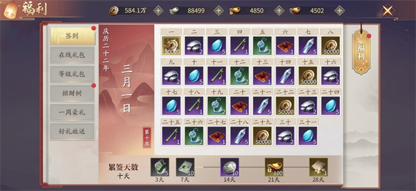 福利包括铜钱、砂铁、星魄石、青丝结、青云佩、见识修炼丹、魂石精等,累签到达一定天数还将获得黄龙佩、内功心得、内库珍宝、绑定元宝和熔铸图纸等稀有道具。