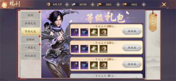 当达到一定等级获得的礼包,包括灵犀之钥、内功典藏礼包、龙潭令和铜钱等道具。