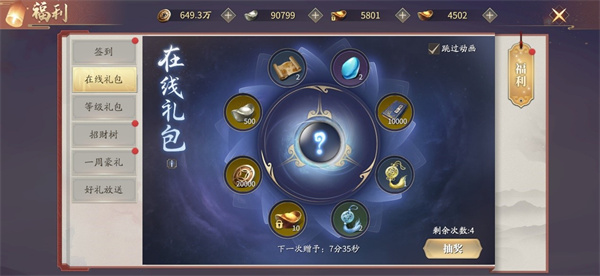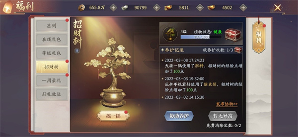 可获得铜钱和绑定元宝,每次摇动摇钱树可获得1次奖励,等级越高,掉落的奖励越多。