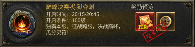 简介:独霸本服,征战跨服,决战巅峰,瓜分灵符。