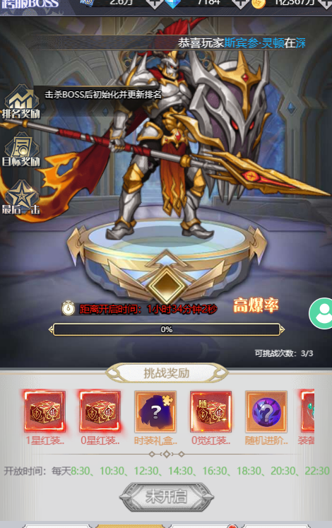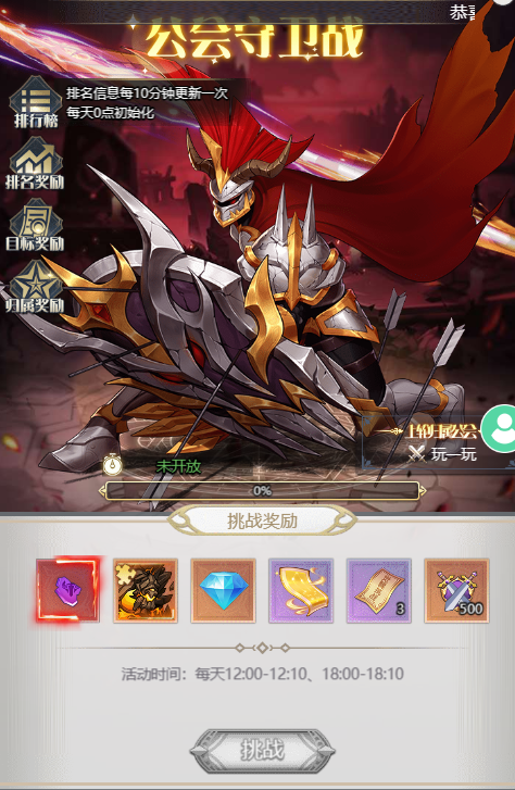 活动时间为每天的12:00-12:10,18:00-18:10,奖励分为挑战奖励、排名奖励、目标奖励和归属奖励,奖励图如下(注意:需要加入公会)