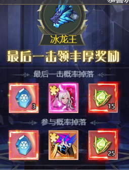 活动时间为12:10-12:40,21:10-21:40,奖励分为最后一击概率掉落奖励和参与概率掉落奖励,奖励如图下