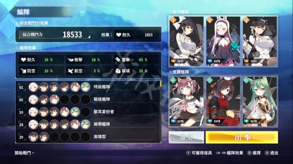 驱逐舰队:雷击+15%,驱逐舰3艘以上。