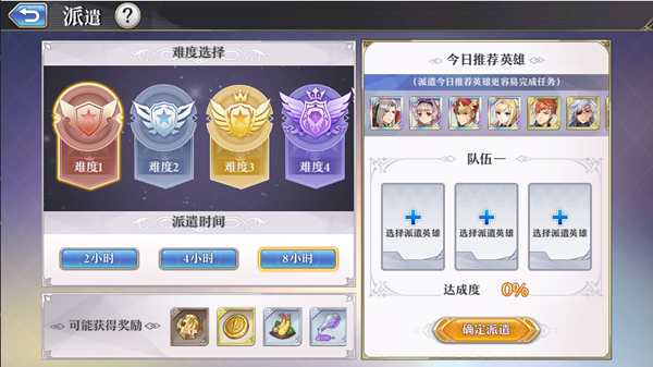 派遣时可选择派遣时间,派遣时间越长获得的奖励越多,派遣时间越短则性价比高;