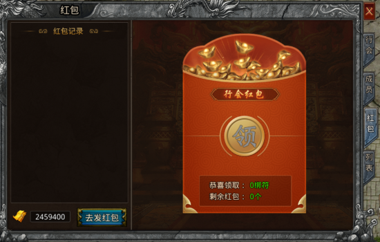 红包界面可领取行会红包,当然你也可以自己发红包,点击去发红包,可以设置红包金额和数量以及祝福语哦~