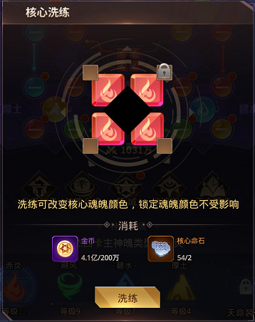 核心神魄也由4部分组成,可以用核心命石进行洗练,洗练时可以锁定魂魄颜色,相应的所需核心命石也会增加。