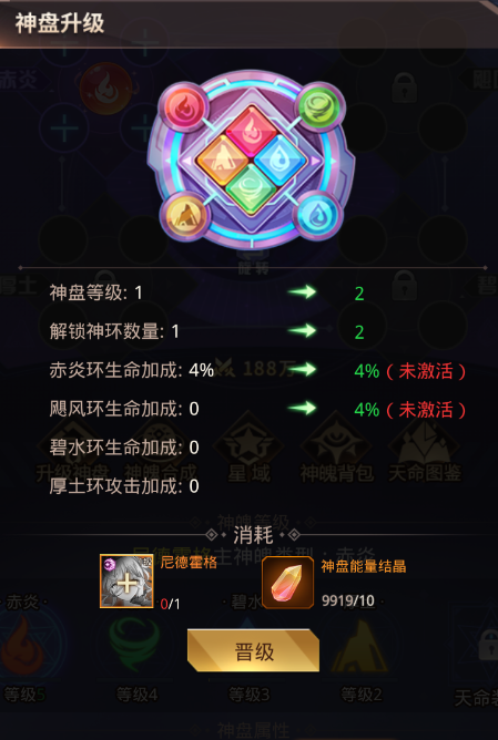 消耗英雄本体和神盘能量结晶可对神盘进行升级,升级后神环获得生命、攻击加成。