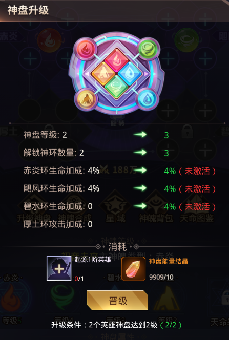 当神盘等级升级到3级/4级时,还需要满足有2个英雄神盘达到2级/有3个英雄神盘达到3级的要求。