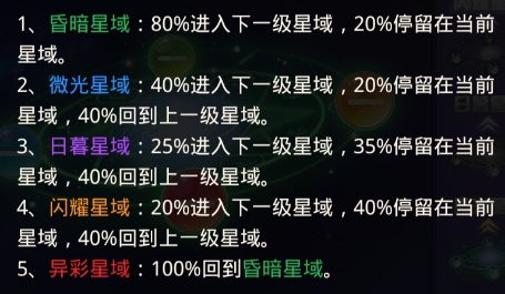 初始在昏暗星域中开始探索,每次探索后,会从当前星域获取奖励,获取奖励后根据概率有机会进入下个品质的星域、停留在当前星域、回退到上一个星域。