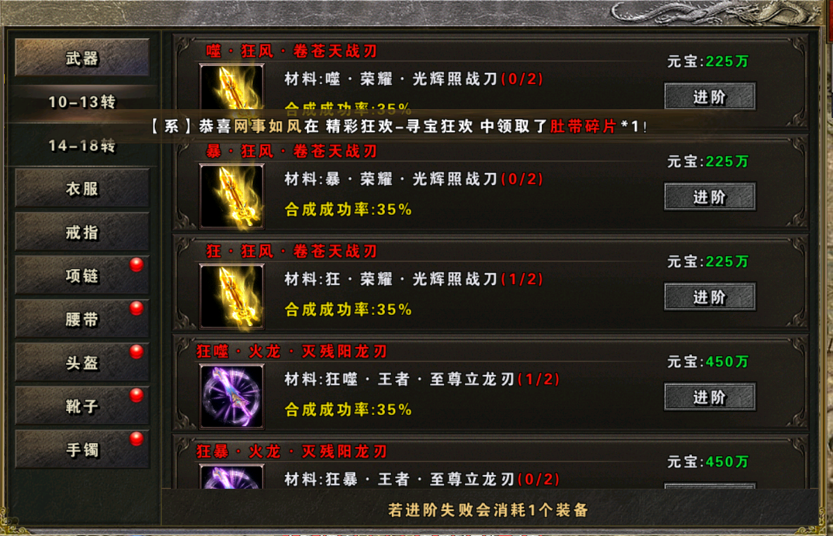 务必参加每日限时活动,十二生肖可产出生肖碎片,能提升你的攻击,防御,生命切割,经验加成。集齐生肖套装还能获得神圣庇护技能,减少PK的时候十步一杀对你的麻痹效果。让你更效率打PK打BOSS升级。血战沙场可产出战神碎片和战神令,提升你的攻击,防御和生命力。激情竞技可产出生肖宝箱和大量元宝。这些都是提升实力必不可少的重要材料。