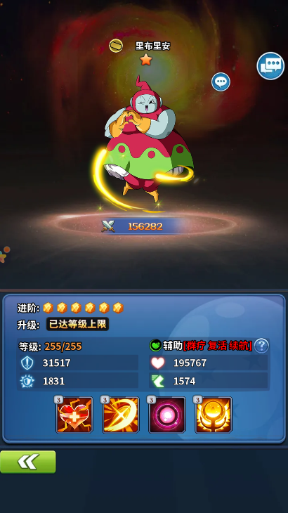 不灭之爱[主动技能]:为己方全体恢复等同里布里安攻击力98%的生命值,并附加【爱心印记】状态,持续2回合;若有【爱心印记】状态下的友方死亡,则提升里布里安15%治疗效果,直到战斗结束