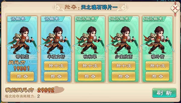 当拥有宝物碎片之后可以在斗剑台参与夺宝,抢夺别人背包里的碎片