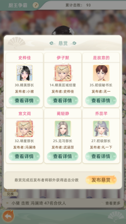 5)悬赏完成后,【发布者】将获取【钻石】和厨王徽记奖励。追击人数达到上限或者悬赏时间到后通过邮件发送奖励。(所以悬赏发布后,可以喊上协会的各位店长一起追击噢,这样子双方都能更快的获取钻石及厨王徽记奖励。)