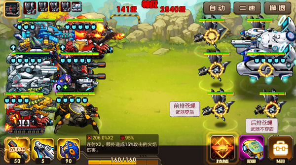 大未来是最难打的阵容,或者最难之一吧。大未来阵容里带了5只苍蝇小弟,因为这种小兵会飞又常常很烦,所以我们把它形象地叫做苍蝇。前排苍蝇带的是蝎尾,可以穿盾,有概率麻痹,也会炸裂;后排苍蝇带老警长,不穿盾,所以前排苍蝇更恐怖。大未来难打的原因主要有3点:①大未来不受控制;②大未来第二回合可以强制把我们麻痹;③大未来第二回合可以满血复活队友,复活就算了,最要命的是复活的同时全体加速,被复活的小兵就像打了鸡血一样,对我们进行疯狂输出,而我们这时还处于麻痹状态,只能被动挨打。所以这关打起来比较棘手,但是大未来绝不是无解的,经过一年多以来在被大未来虐待下的思索,以及同机友(机兵好友)的不断探讨,总结了以下几种打法,写下来供玩家们参考。