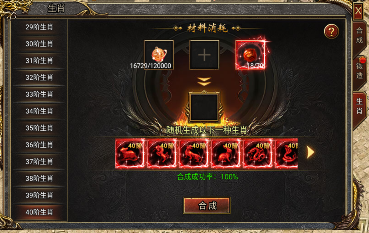 2、当佩戴满全部生肖后,有一最低且没有同阶的生肖,合成时使用该生肖或背包里面相同的生肖,会定向合成出该种生肖,若此时该种生肖不是最低阶,则剩下的同阶生肖还是随机合成。
