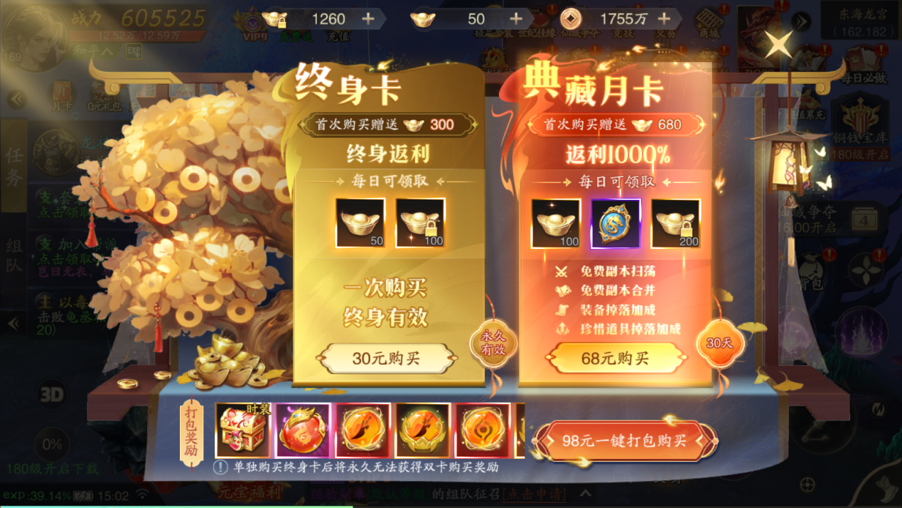 月卡作为每个游戏性价比最高的充值道具来说,一定是最值得购买的。并且,《逍遥九歌行》中的月卡,还能增加道具的掉率,并且给到个人boss的入场券。游戏中还有终身卡,购买一次就能终身领取,平均每日下来的成本可以说是非常的低了,坚持一个月就相当于每天用1块钱购买100个绑定元宝和50个元宝,坚持一年就相当于每天用0.082块钱购买,坚持的越久,收益越高哦。