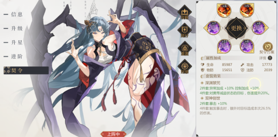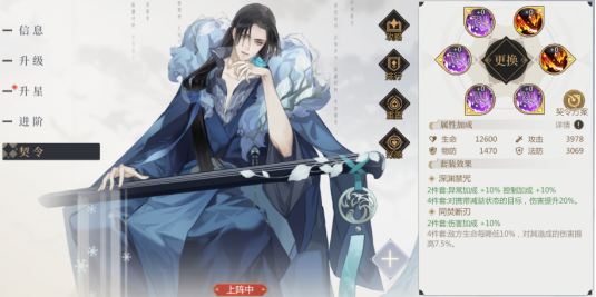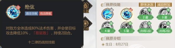 十二律的群攻可以使敌方攻击降低且概率冰冻,且此英雄十分契合这套阵容,十二律怒气回复与冰冻几率均受敌方减益状态影响