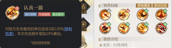 飞作为本套阵容的核心输出,拥有高额的暴击伤害可以实现单点秒杀
