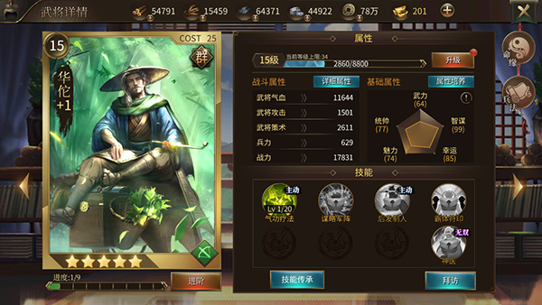 通过武将拜师可以升级属性和提升武将技能。提升武将属性的同时也会增加战力。