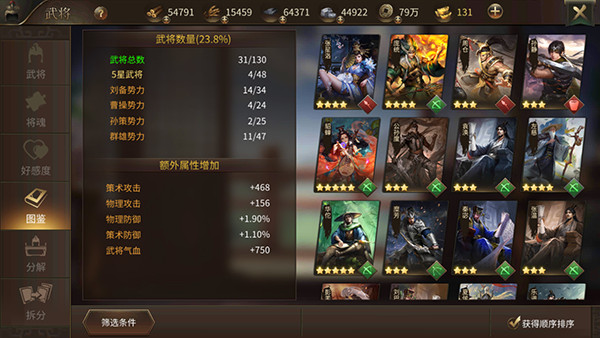 通过点将,酒宴,赠礼可以获得不同或者相同的武将,收集不同的武将可以激活武将图鉴增加属性,并且武将也有强弱之分,选择更强大的武将对于战力的提升非常有帮助