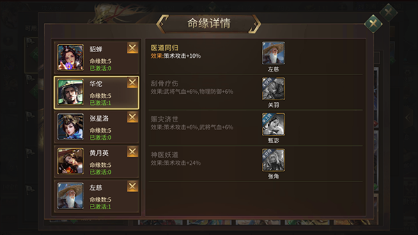 部队中的武将如果存在可激活的命缘,可以增加武将之间的属性提升战力