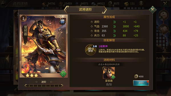 通过点将和酒宴获得相同的武将,进行进阶,可直接提升武将属性和技能,一次提升武将属性增强战力