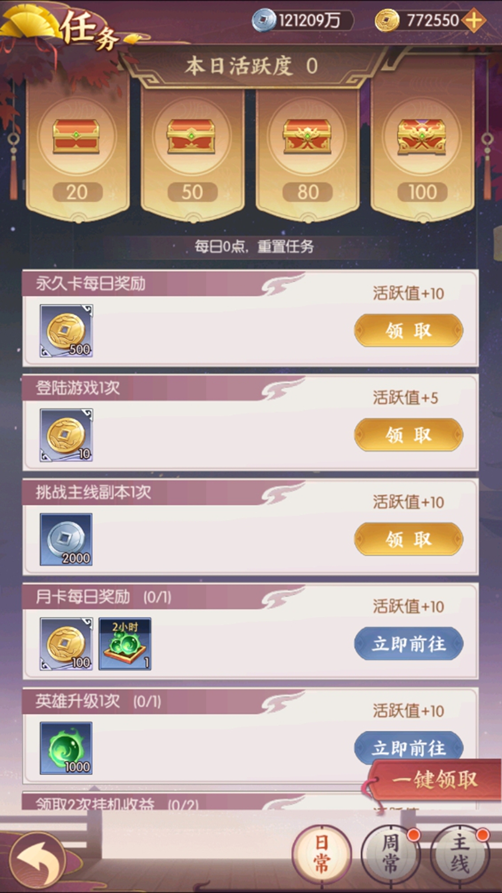 日常任务每日均会重置,完成每日任务获得对应奖励,任务完成至一定进度可激活宝箱奖励,100活跃度宝箱中的魂玉、贵族经验值更是不容错过。
